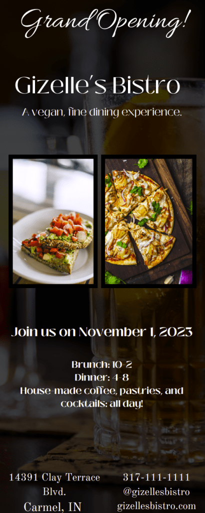 This flyer was created using Canva during the Spring 2023 semester as part of a fictitious marketing project for a digital writing course. The purpose of the project was to create a visually appealing and informative flyer for public distribution announcing the grand opening of a local restaurant. Students were provided with a list of required informational elements as well as document design parameters for the creation of the flyer.