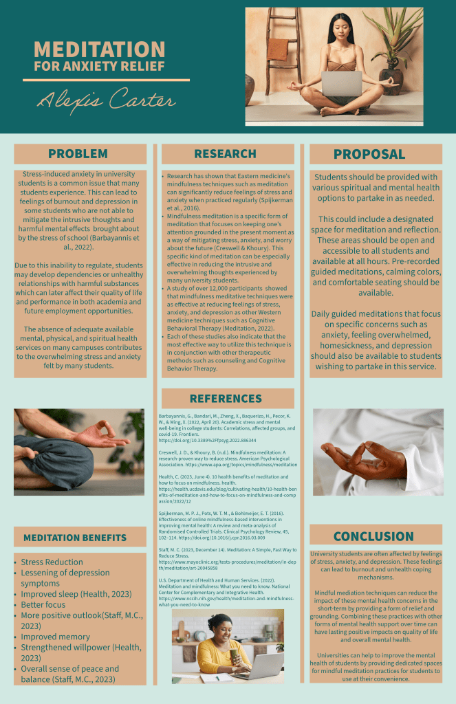 This document was the final project in my Spring 2024 complementary health therapies course. The informational poster combines principles of document design with academic research to create a highly informative, visually appealing, easy-to-read research project. The format of the poster was designed for use as a display at an academic health fair.
