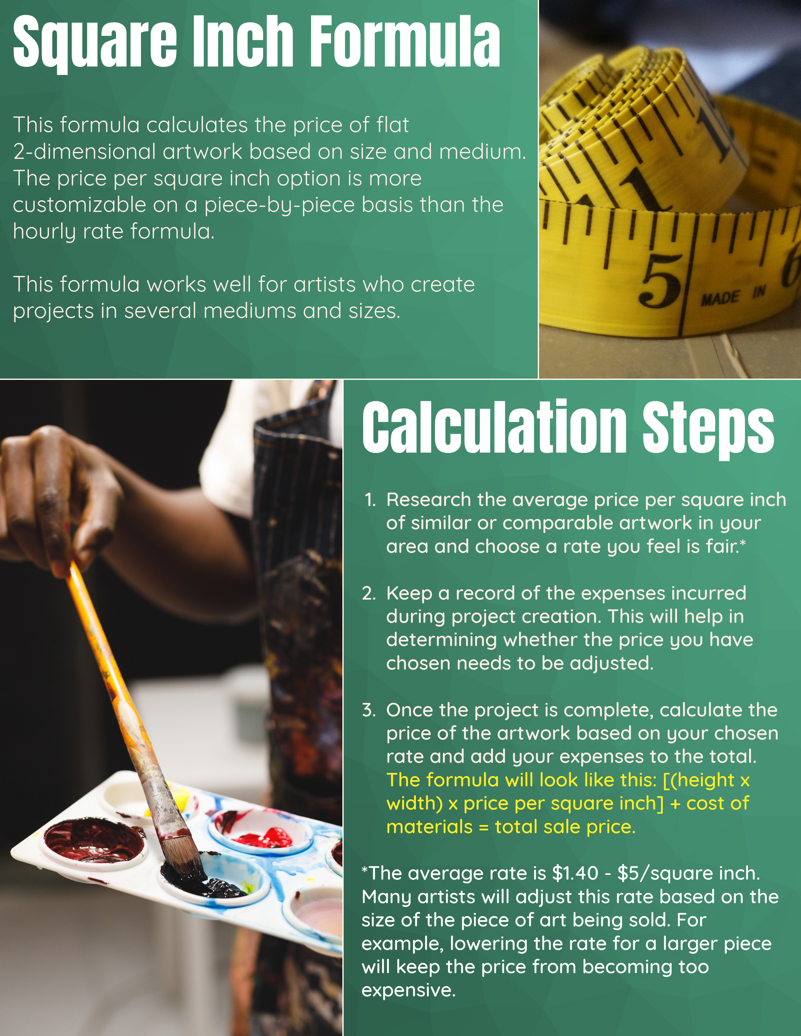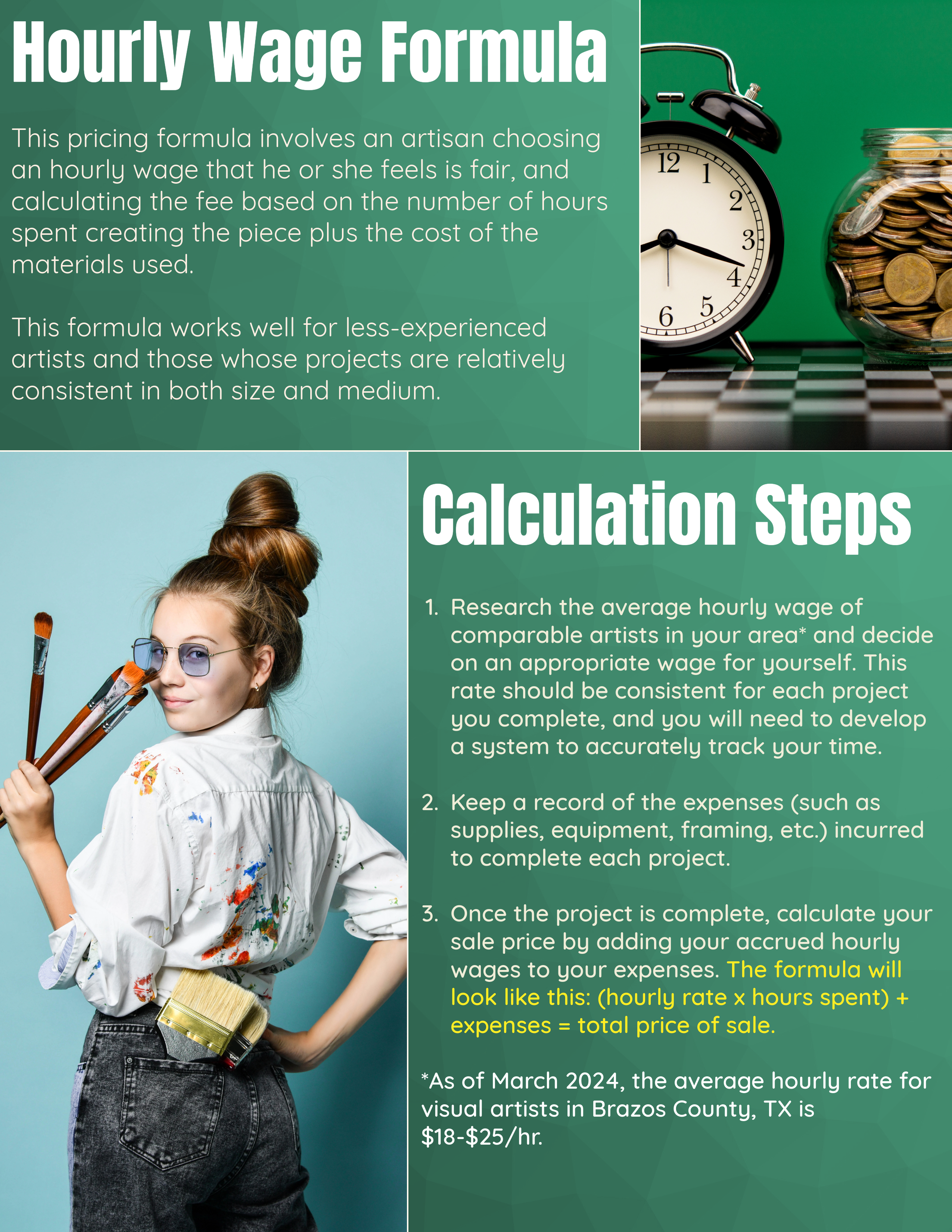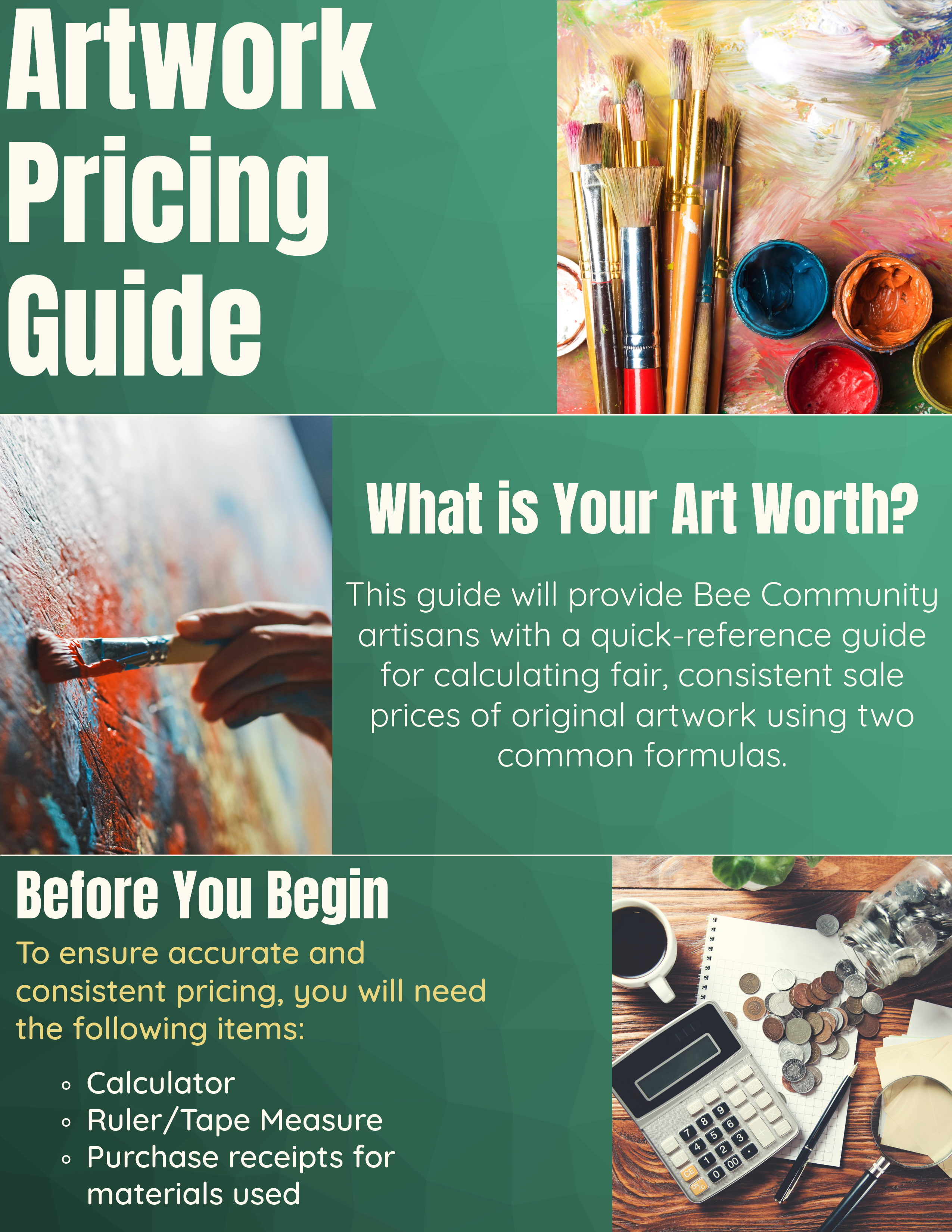 These instructions were developed during my partnership with the Bee Community. My contact in the company informed me that they needed a set of instructions for their artisans to use when pricing their art. To accomplish this, I created a booklet featuring two different common calculation formulas that could easily be adapted to any medium, size, and style of art. This document showcases my organizational abilities as well as my creative design capabilities in developing informational material that is both engaging and easy to follow.