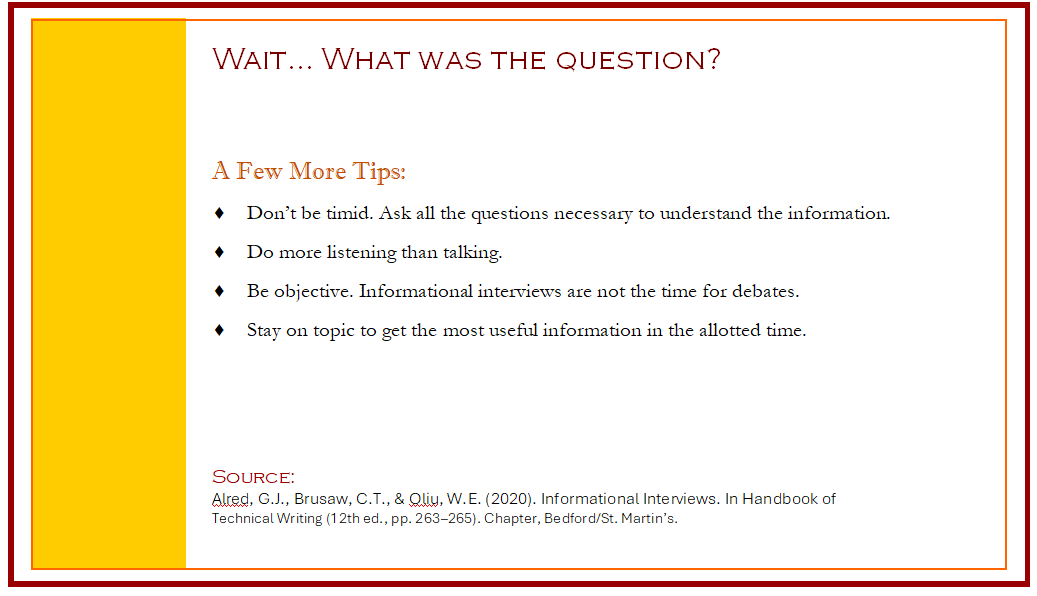 This postcard was part of a design project for my Spring 2024 advanced technical writing course. I chose to create a postcard on conducting informational interviews with subject matter experts. The purpose of the postcard was for potential distribution in a writing center and was intended for an audience ranging from novice to advanced writers.