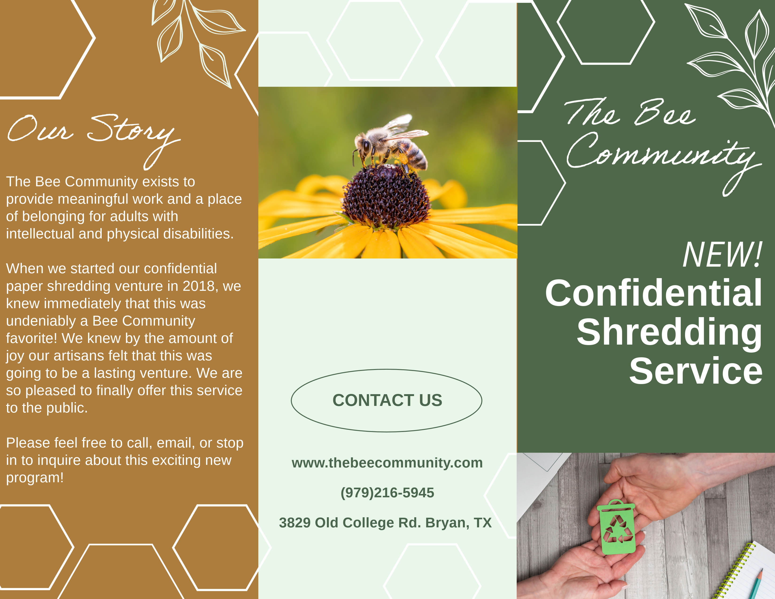 This project was created as part of a semester-long partnership with a local nonprofit organization. Using Adobe Creative Suite, I created this brochure for the Bee Community as part of their roll-out campaign for a confidential paper shredding service.