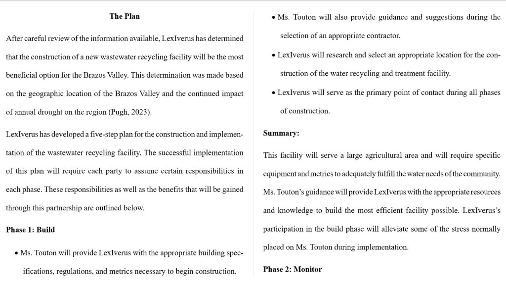 This proposal was the final element in a semester-long project for a technical report writing course in the Spring 2023 semester. The project focused on finding a potential local solution to a global crisis and creating a proposal for partnership with a specific person or business to implement in my community. My focus was on the global water crisis and how it could be solved in my community through wastewater recycling measures. The excerpt below is the first step of the action plan for implementation.